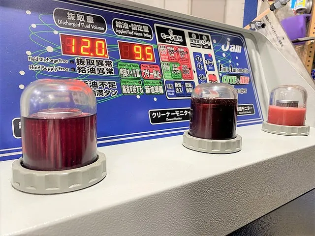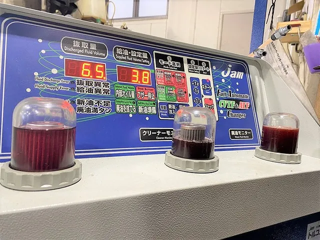 ほぼ新油のはずなのですが、細かいパイプやトランスミッションのシステム内に残留する廃オイルが混ざってこの色です。