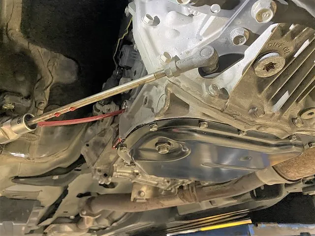 オイルパンを取り付け、新油のCVTフルードをトランスミッションに充填します。