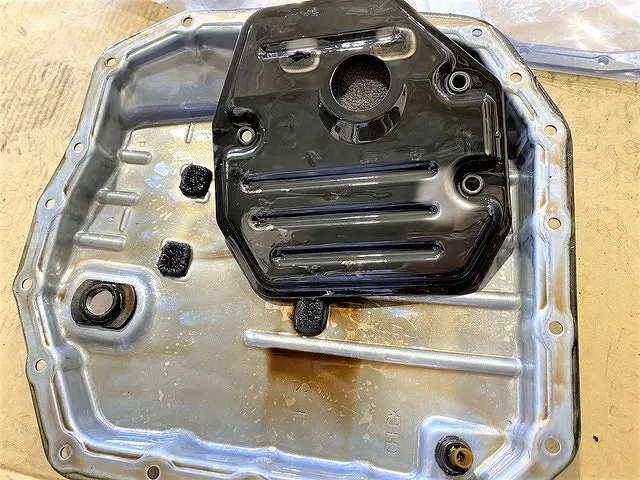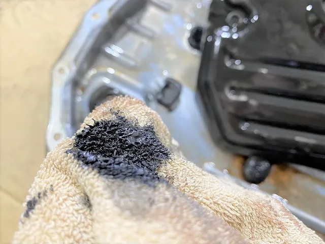 さきほどオイルパンを脱着した際に4リットルほどは廃オイルが抜けたはずなのですが、トランスミッション内部に残留しているCVTフルードがまだまだこれだけ残っているんだと実感する1枚です。