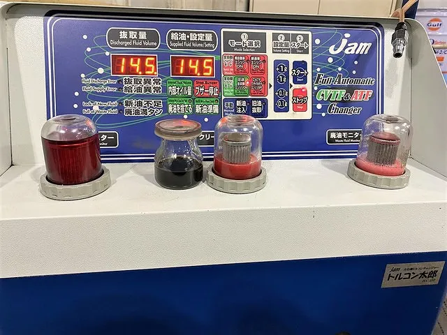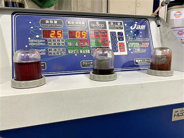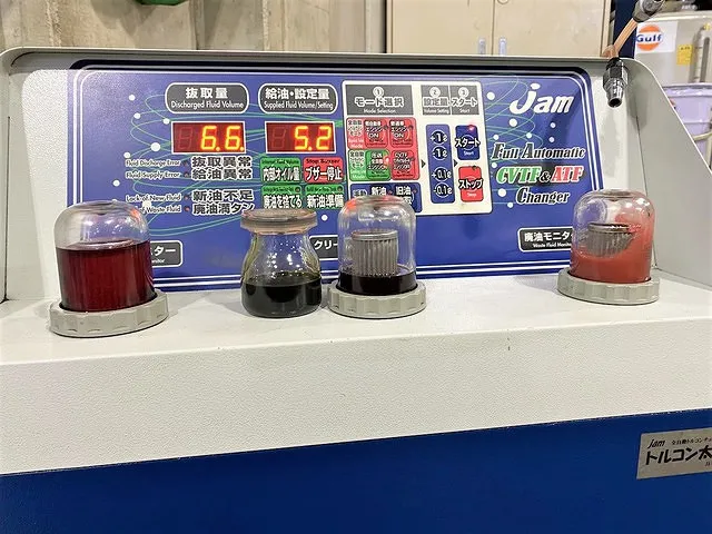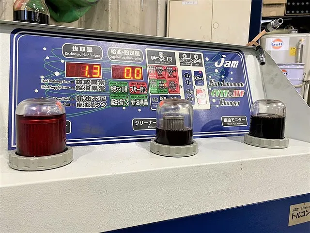 一番右側の廃油モニターでは、ミッション内の残留していた廃油と混ざったフルードが見えます。