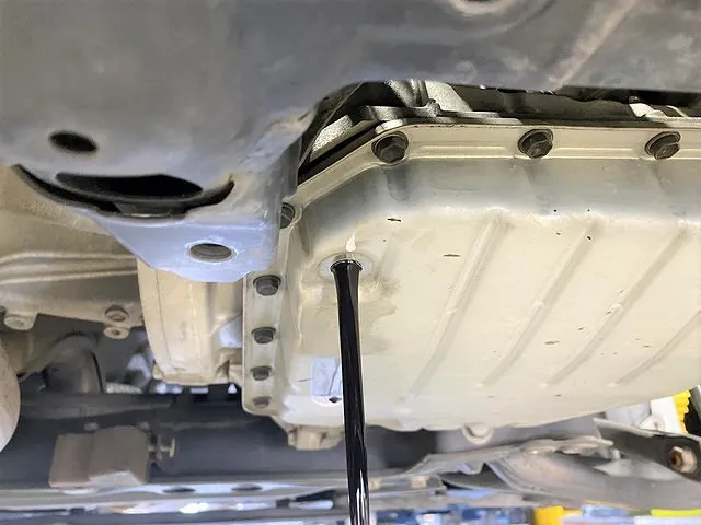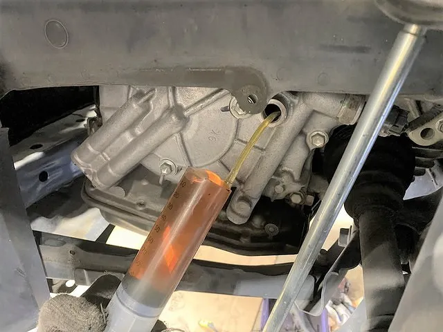 オイルパンを取り付け、さっき抜いた分のCVT新油をトランスミッションに充填します。