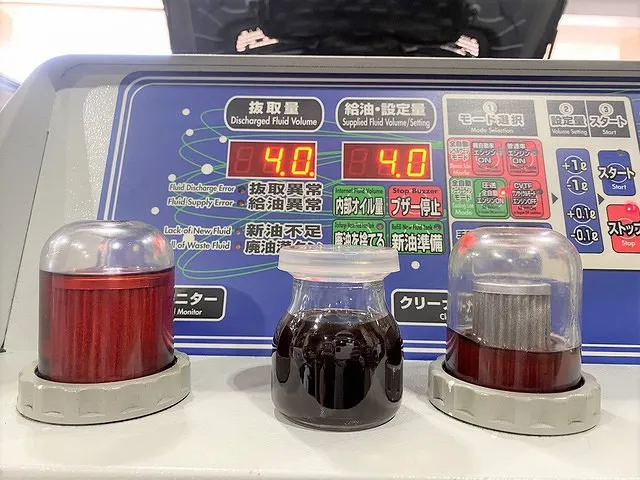 廃油を抜いた分、新油を少しずつ給油しています。