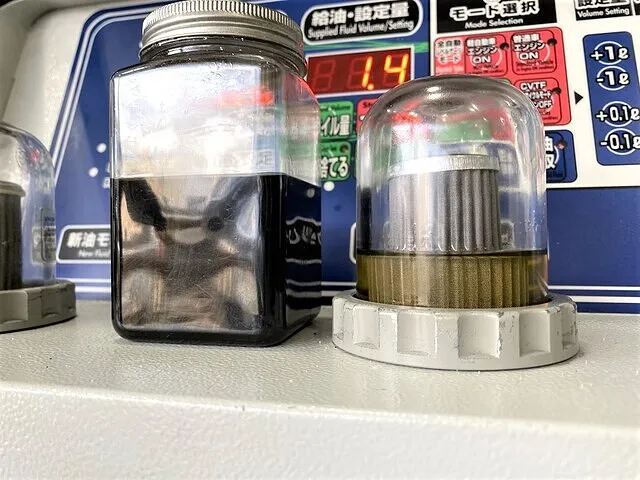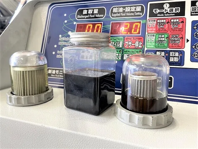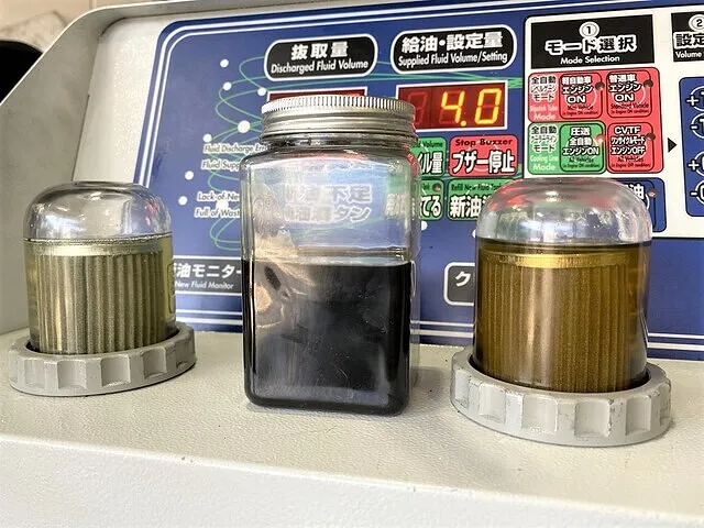 右 廃油モニター・・トランスミッションから抜き取られた廃PDKオイルが見えます(AT内には二度と戻りません)