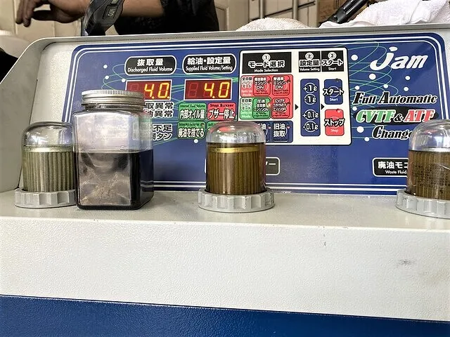 交換後はオーバーフローのためテスターで油温を確認しながら油量を調整、調整が完了したらテスターでリセット(キャリブレーション)を施工します。