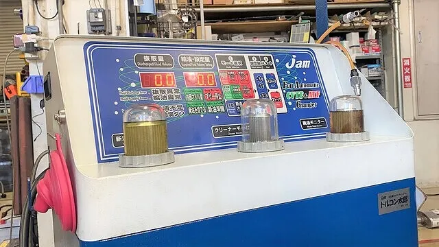 ですがご安心ください。トルコン太郎ではそのフルード中に浮遊する鉄粉やスラッジを圧送しながらクリーニングすることが可能なため、過去未交換でも10万km以上の過走行車両でも対応することが出来るのです。