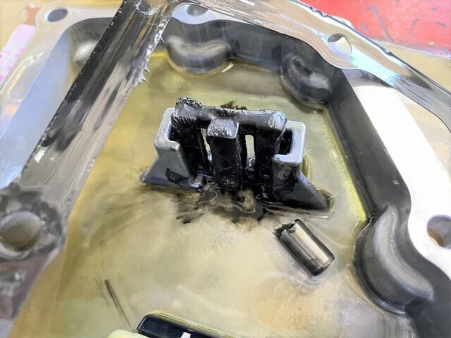 オイルパンに流れ出ているように見える黒色状のものが、鉄粉を含むスラッジです。