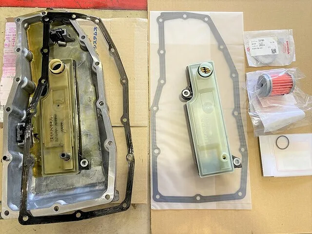 今回のご希望はまだしばらく長く乗り続けていく準備でのAT内部のリフレッシュのため、オイルパンを脱着しての鉄粉やスラッジの清掃やストレーナ交換を施工してきます。