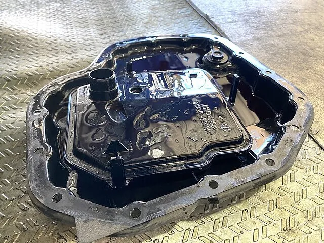 ぬらぬら状態のATオイルパン内部、実はスラッジがビッシリと付着していてこの状態です。