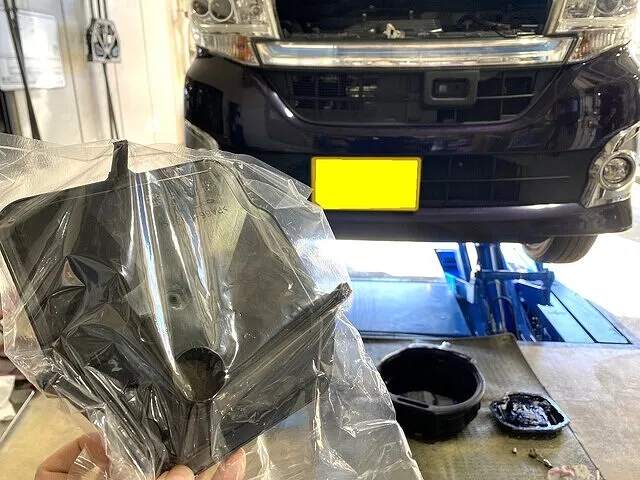 オイルパンを取り外す前には圧送交換の際でしか使用が出来ないATフラッシュを入れ20分ほどエンジンをかけて添加剤を隅々まで行きわたらせ、汚れが落ちやすくなるように準備済み。