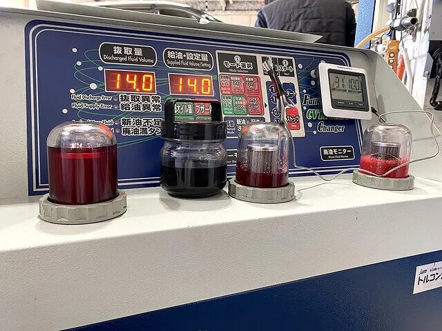 トルコン太郎での圧送交換は油量は多く使用するため高額整備ですが、交換の効果を感じることができるので、整備の中でもお車が変化した実感を得やすい整備だと思います。