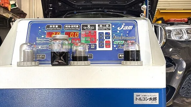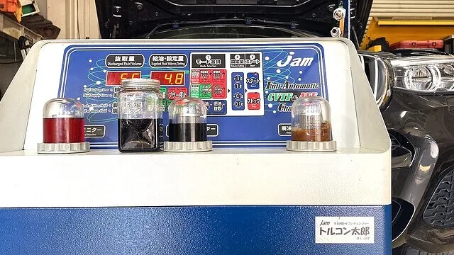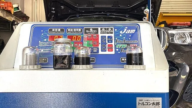 圧送交換整備では、弊社で使用しているフラッシング剤を添加してから数十分、ATFを交換中とクリーニング中はずっとエンジンを稼働させています。