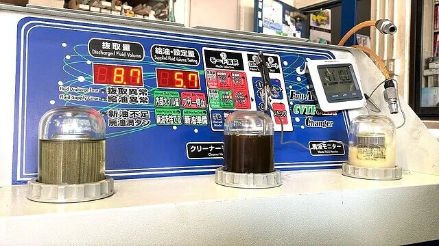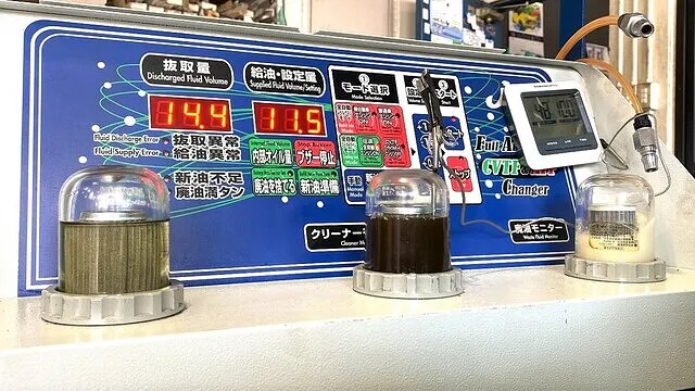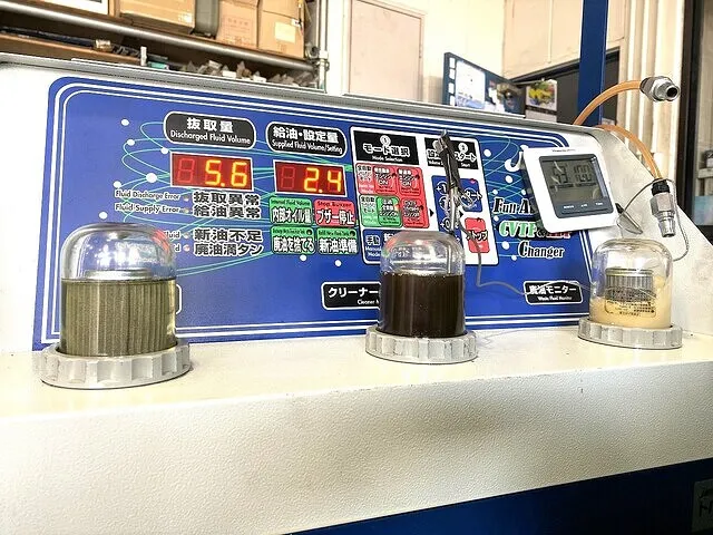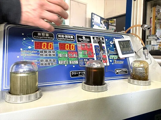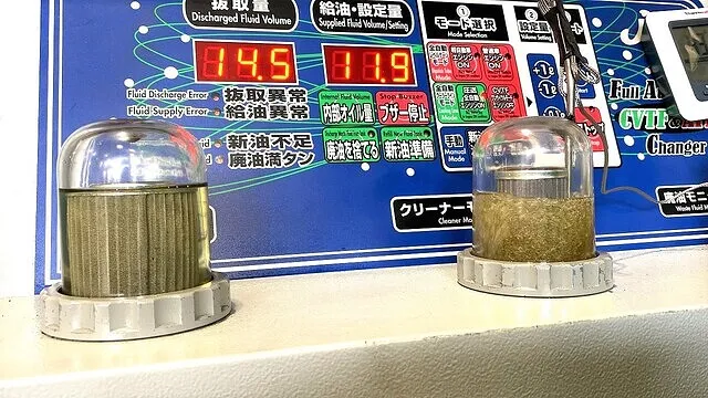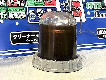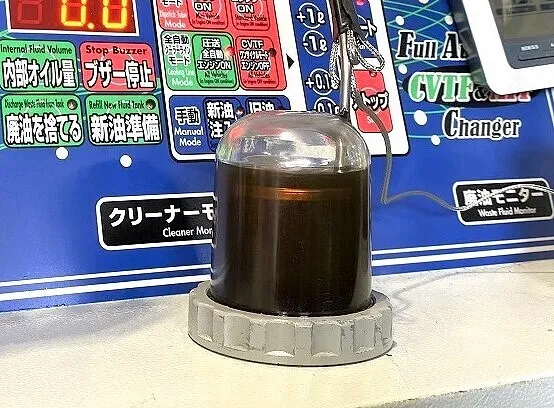 右 【廃油モニター】ATから抜き取られた廃DSGオイルの状態が確認できるモニター