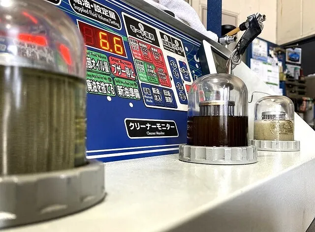 一番右の廃油モニターに見えるのは、トランスミッションから抜き取られている廃油です。