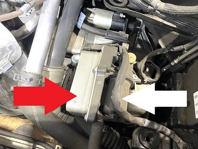 ④赤い矢印はATオイルクーラー 白い矢印がDCTオイルフィルターが入ったケース