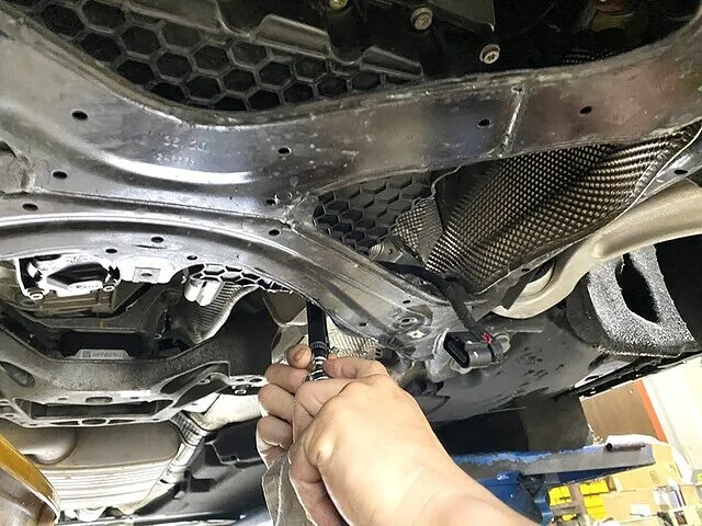 画像は、下回りのオイルクーラーへ専用アタッチメントを接続している一枚です。