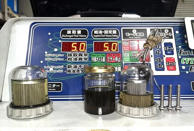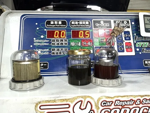 親油モニターとはクリーニングモニターの間にある小瓶は、トランスミッションから抜き取った廃油サンプルです。
