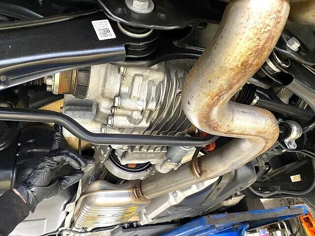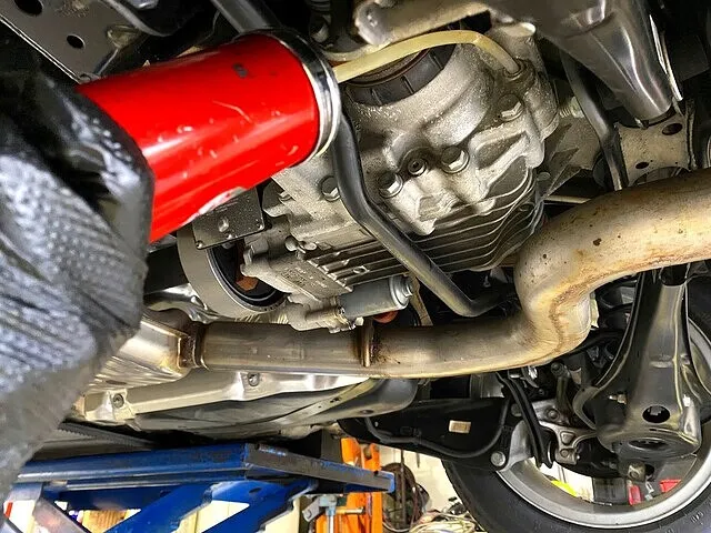 下回り中間地点あたり、マフラーパイプが右によけているあたりにリアデフとハルデックスが位置します。