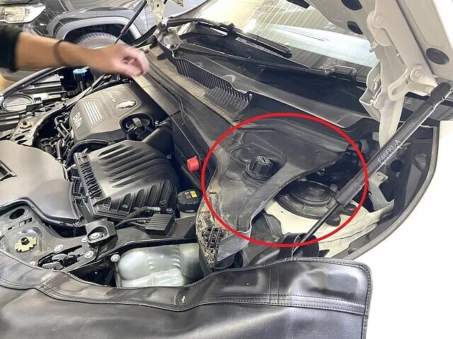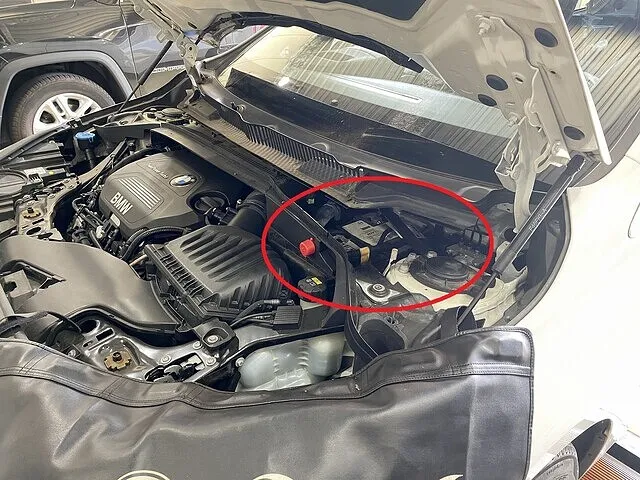 画像で赤丸で囲んだ部分エンジンルーム奥、カウルトップ下に位置します