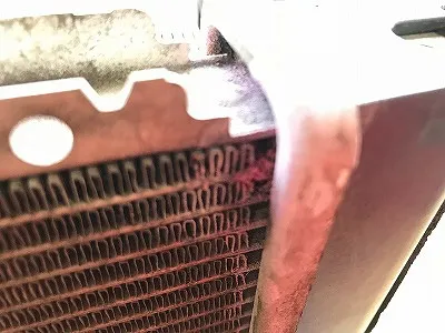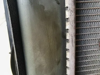 水分が出て、それが蒸発した跡が見えますね。 ラジエータコアの部分のうねうねしたルーバー部分に白く跡が残っていますね。